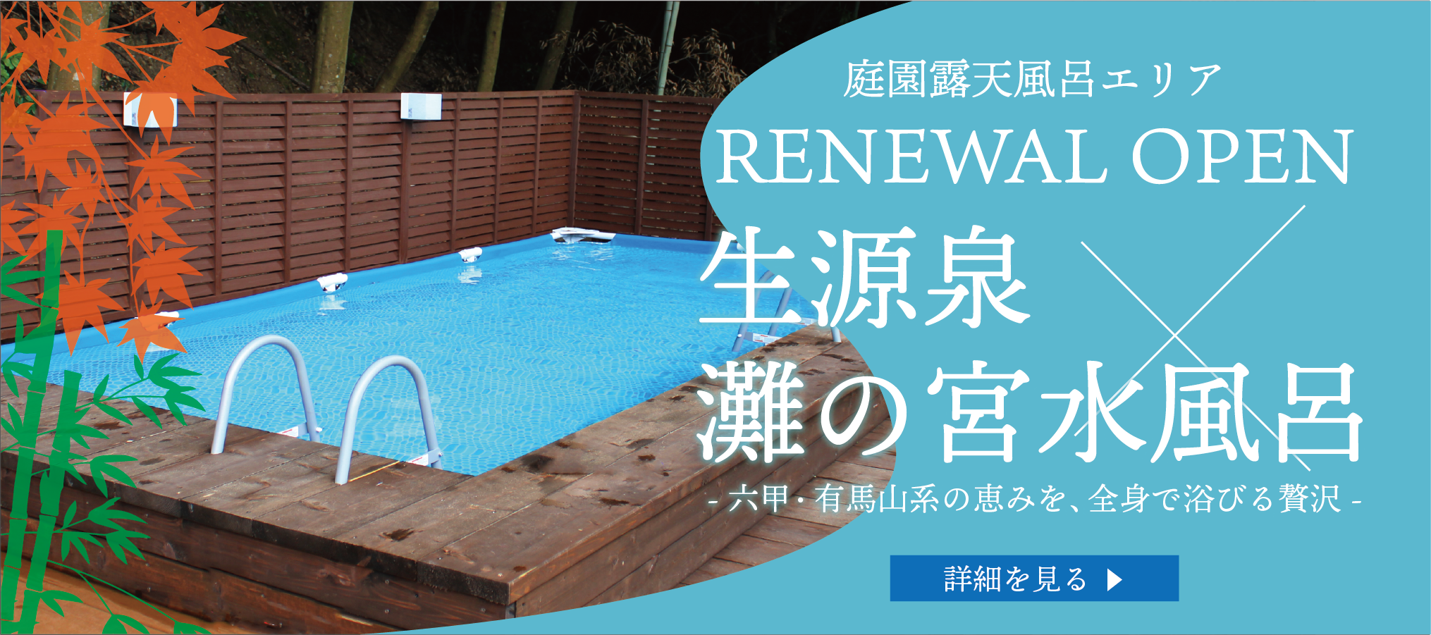 当館は地下1,100mから湧き出る弱アルカリ性単純温泉で、別名「美肌の湯」とも呼ばれている、刺激が少なく柔らかい体にやさしい「天然温泉」と、江戸時代後期から灘吾郷の酒造に欠かせない名水として知られ、ミネラル分が豊富かつ、美容や健康維持、リラクゼーション効果もあると言われている「日本名水百選」にも選ばれている「宮水」が自慢の温泉です。
