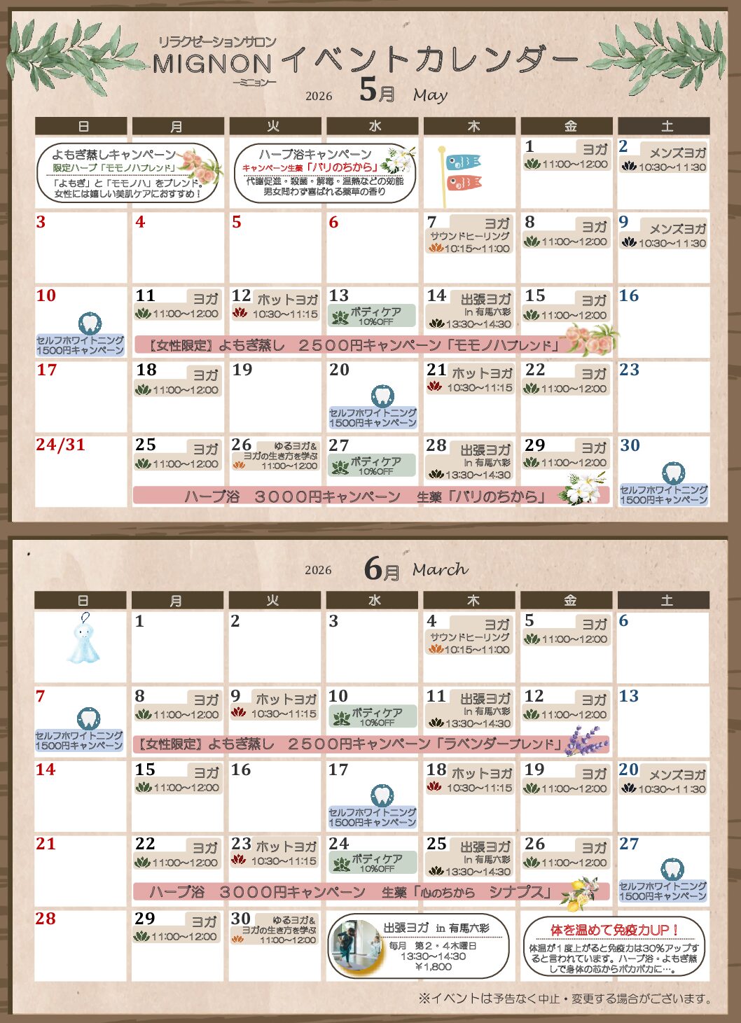 ハーブ浴・よもぎ蒸し・ヨガ・セルフホワイトニングなどのお得なイベント盛りだくさん! ヨガの詳細はこちら ハーブ浴・よもぎ蒸しの詳細はこちら ポイントが貯まる!使える!⇩ご予約はこちらから⇩お電話でもご予約受付中!TEL...