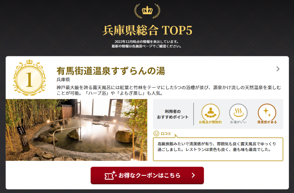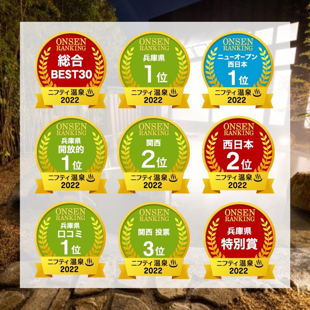New Topics!! 2022.12.14 ニフティ温泉年間ランキング2022 兵庫県総合第1位!!9部門入賞♪ この度、”ニフティ温泉年間ランキング2022”において『兵庫県総合』『口コミ部門』『お風呂が開放的』『特別賞』『ニューオープン部門』から「有馬街道温泉すずらんの湯」が1位を受賞しました!更に西日本、関西エリアの総合で2位!16,293施設の中から選出する全国総合でも25位に選ばれました。 これもひとえに、皆様方のおかげと感謝いたしております。今後とも「有馬街道温泉すずらんの湯」を宜しくお願いいたします。 投稿者: suzurannoyuNew Topics!!コメント: 0