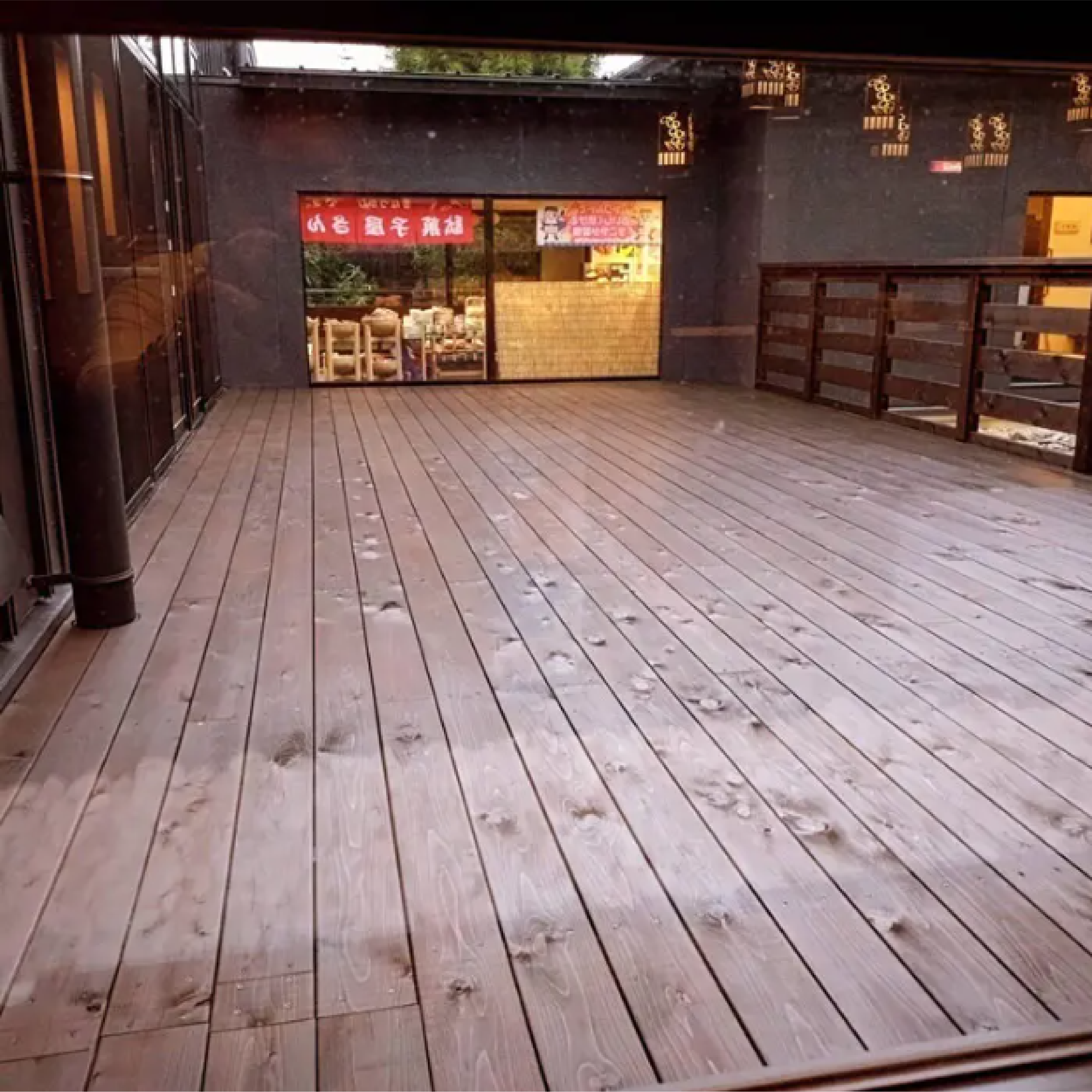この春に完成した「ウッドデッキ(テラスエリア)」は、お風呂に入った後のんびり寛げる場所として、館内の中庭を改装して作られました。ロビーにつながっているので出入りがしやすく、大型のソファなども設けられています。