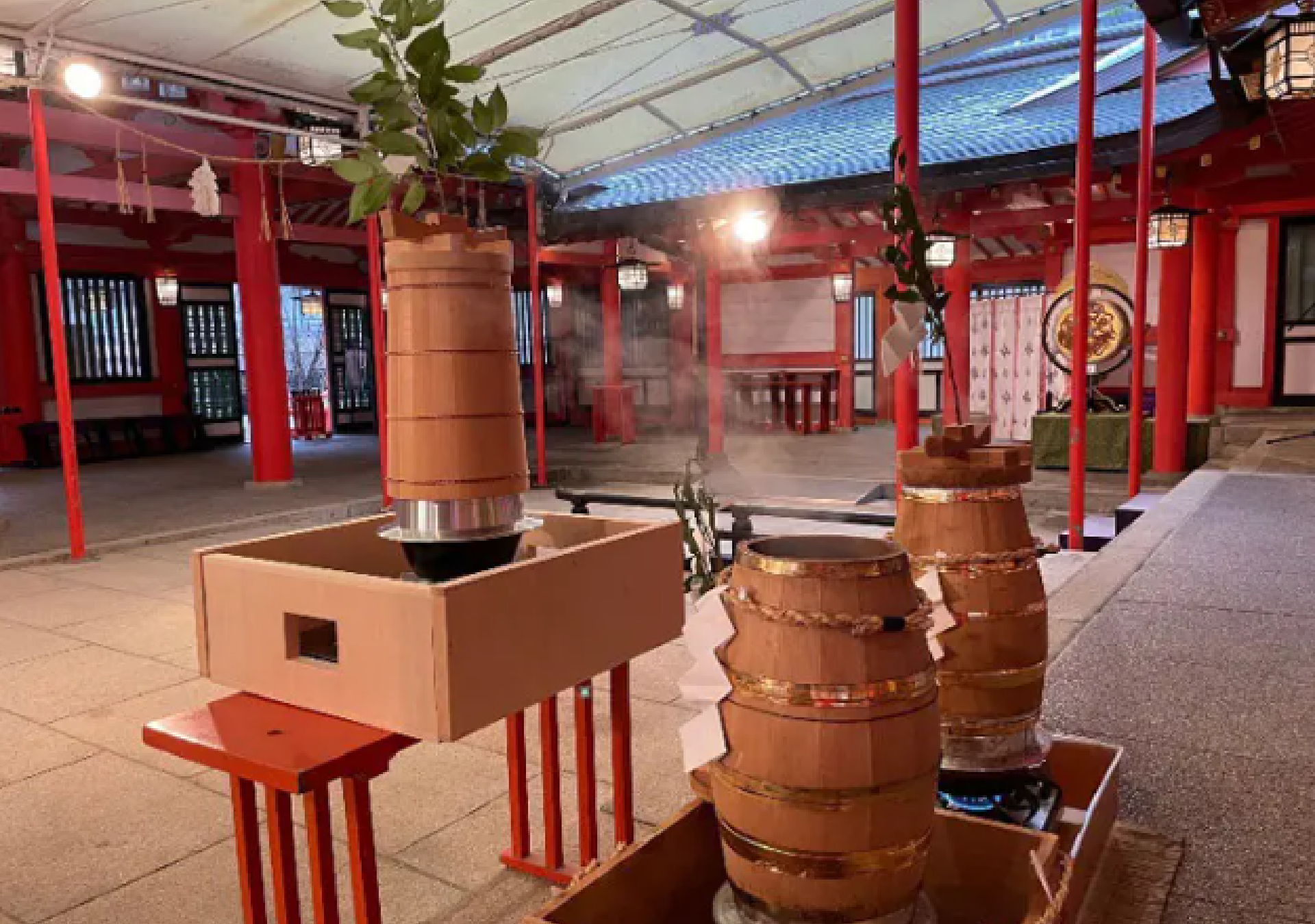 ウッドデッキ(テラスエリア)完成記念イベントとして「鳴釜神事(なるかましんじ)」をゴールデンウィーク初日の4月27日の17時からロビー横のウッドデッキで開催致します。