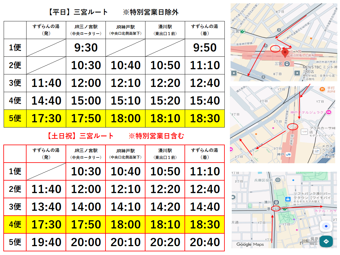 - 特別営業日はHPのおしらせをご確認ください。※三宮周辺でのイベント開催時は運行時刻の変更、または運休になる場合がございます。