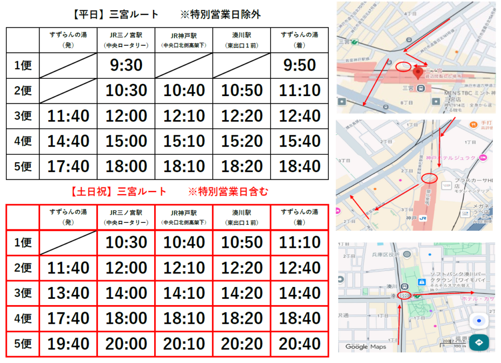 - 特別営業日はHPのおしらせをご確認ください。※三宮周辺でのイベント開催時は運行時刻の変更、または運休になる場合がございます。