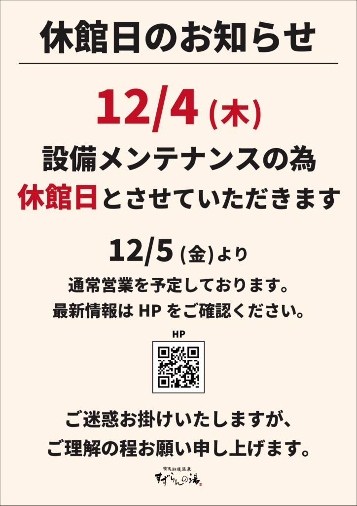 12/4(木)は館内設備点検の為、休館日とさせていただきます。