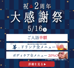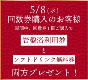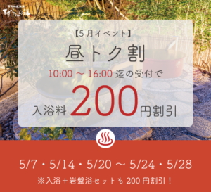 ![]() <シニアデー> 5/29 65歳以上のお客様ご入浴利用で 次回使える平日600円でご入浴可能な チケットをプレゼント。 ※年齢確認が可能な証明書のご提示が必要となります。 |