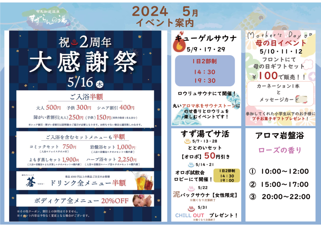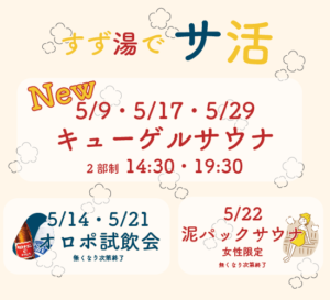 ![]() <すず湯でサ活> ■5/9・5/17・5/29 キューゲルサウナ 丸型のアロマ氷をサウナストーンに置き、 香りとロウリュを楽しむイベントです! ■5/14・5/21 オロポ試飲会 14:30 19:30 ■5/22 泥パックサウナ 他にも、ととのいセット50円引きなど盛りだくさん! |
