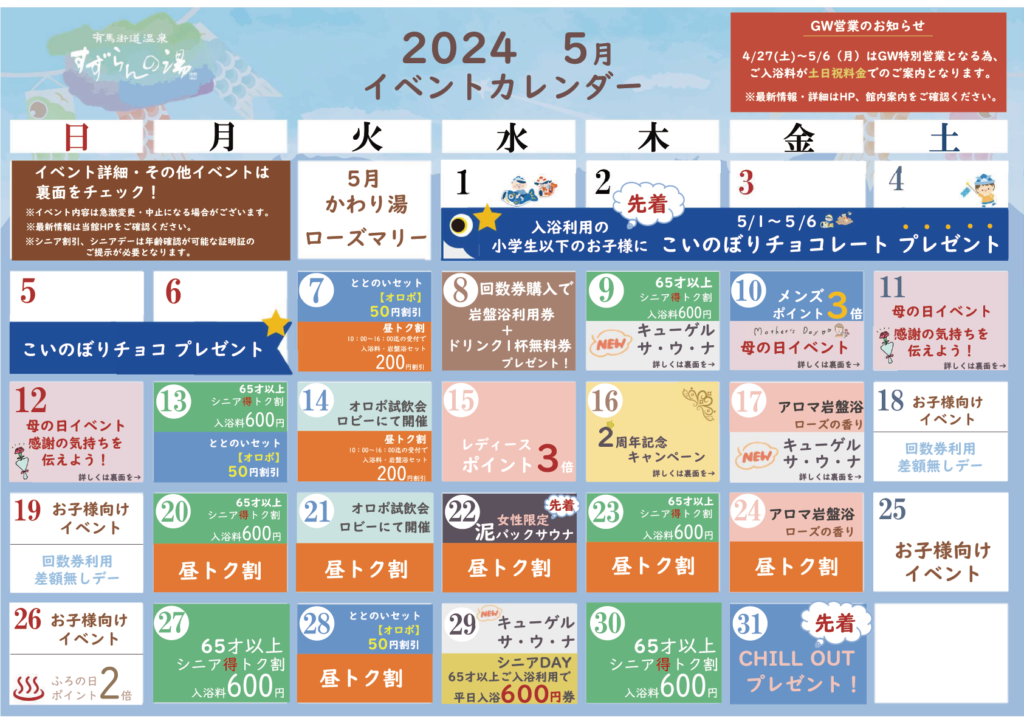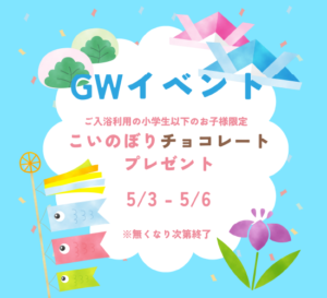![]() <GWイベント> 5/1~5/6 ご入浴利用の小学生以下のお子様に、 こいのぼりチョコレートをプレゼント! ※なくなり次第終了となります。 |