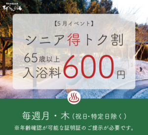 ![]() <シニア得トク割> 毎週 月・木(祝日除く) 65歳以上の方、入浴料“600円” ※ご利用には年齢確認可能な証明書のご提示が必要です。 |