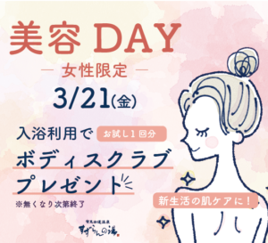 ![]() <美容DAY> 3/21(金) 入浴利用でお試し1回分の 「ボディスクラブ」をプレゼント! ※女性限定 ※ご希望の方は受付の際に必ずお声かけください。 ※なくなり次第終了となります。 |