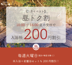 ![]() <昼トク割> 毎週火曜日(祝日・特定日を除く) 10:00~16:00迄の受付で入浴料“200円割引” さらに!入浴+岩盤浴セットも“200円割引” |