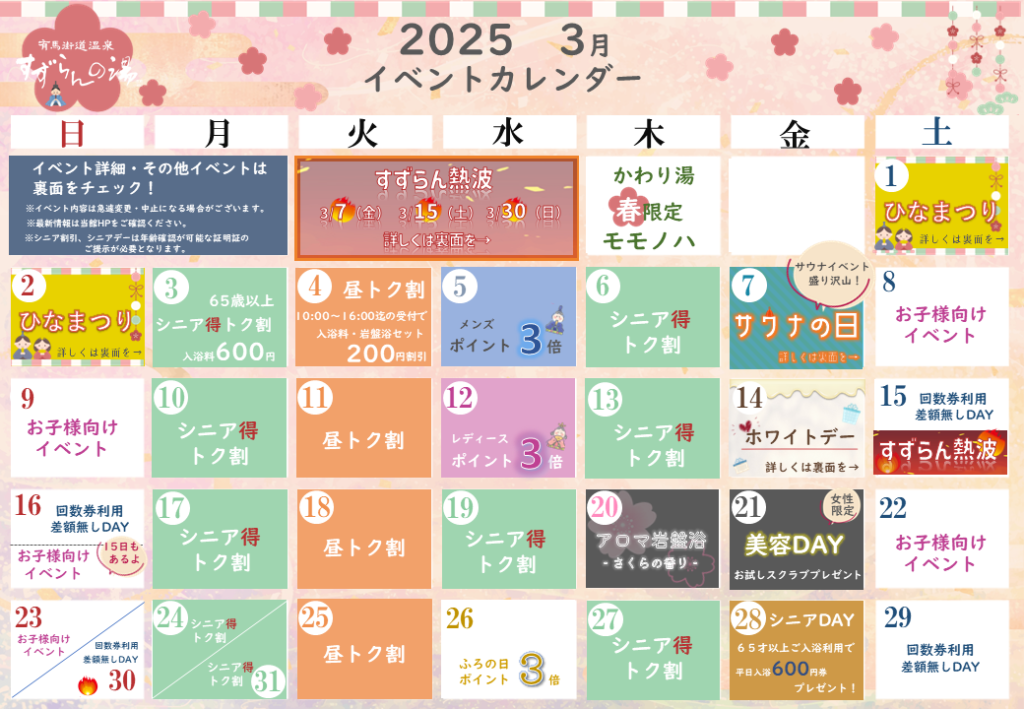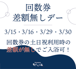 ![]() <回数券差額無しデー> 3/15(土)・3/16(日)・3/29(土)・3/30(日) 回数券の土日祝利用時の差額が無しで ご入浴いただけます! |