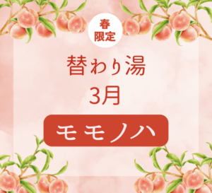 ![]() <3月 替わり湯> 春限定ハーブ「モモノハ」 季節の変わり目の肌トラブル改善が期待できる、 モモのハ風呂でより一層リラックスしたひと時を。 |