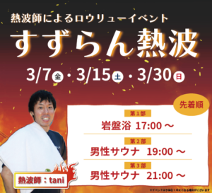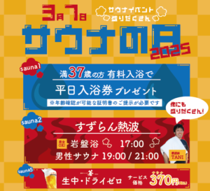 ![]() <サウナの日2025> ロウリュイベントや生中・ドライゼロが370円に! さらに、有料入浴の満37歳のお客様には平日入浴券プレゼント! 3/7はすずらんの湯でサ活! 詳細はこちらをクリック |
