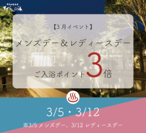 ![]() <メンズデー&レディースデー> 3/5 メンズデー・3/12 レディースデー 対象のお客様ご入浴ポイントが“3倍” LINE登録でポイントカードをGET! 10ポイント貯まるとご入浴1回無料! |