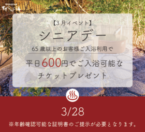![]() <シニアデー> 3/28(金) 65歳以上のお客様ご入浴利用で 次回使える平日600円でご入浴可能な チケットをプレゼント。 ※年齢確認が可能な証明書のご提示が必要となります。 |
