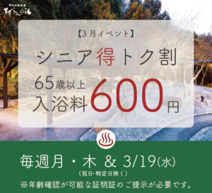![]() <シニア得トク割> 毎週 月・木&3/19(水)(祝日・特定日除く) 65歳以上の方、入浴料“600円” ※ご利用には年齢確認可能な証明書のご提示が必要です。 |