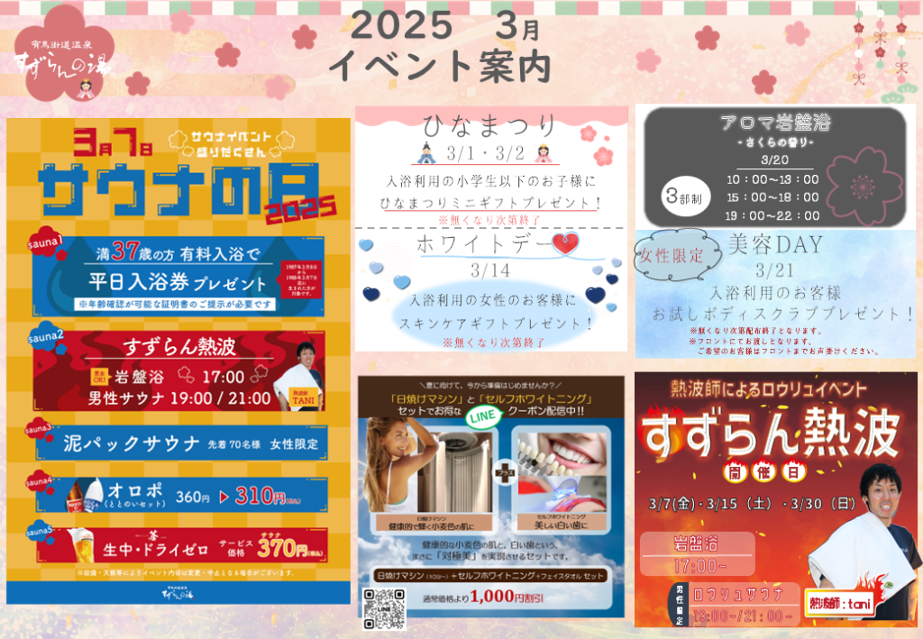 ![]() <ひなまつりギフトプレゼント> 入浴利用のお子様に、ひなまつりミニギフトを プレゼント! ※ご希望のお客様はフロントへお声かけください。 ※なくなり次第終了となります。 |