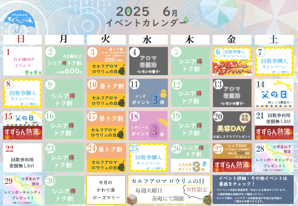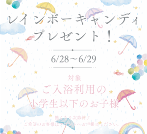 ![]() <レインボーキャンディ プレゼント> 6/28(土)~6/29(日) ご入浴利用の小学生のお子様にプレゼント! ※無くなり次第終了となります。 ※ご希望の方は、必ず受付の際にお声かけください。 |