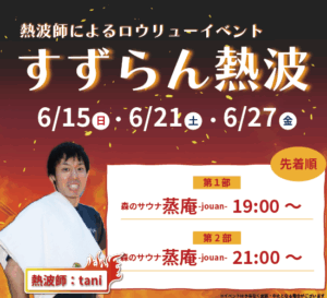 ![]() <すずらん熱波> 6/15(日)・6/21(土)・6/27(金) すずらんの湯の熱波師によるロウリューイベント 第一部:森のサウナ 蒸庵 19時~ 第二部:森のサウナ 蒸庵 21時~ ※先着順となります |