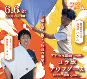 ![]() <すずらん熱波-特別編- コラボアウフグース> 6/6(金) 18:00 (岩盤浴 男女)/ 20:00(森のサウナ蒸庵-jouan-男性のみ) 鶴見緑地湯元水春 熱波師のバジルさんと、当館の熱波師TANIのコラボアウフグースを開催! ここでしか体験できない熱波の衝撃をぜひ! 女性のお客様のご要望にもお応えしまして、18:00の部は岩盤浴にて開催に変更いたします! |