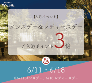 ![]() <メンズデー&レディースデー> 6/11 メンズデー ・6/18 レディースデー 対象のお客様ご入浴ポイントが“3倍” LINE登録でポイントカードをGET! ポイントを貯めて入浴1回無料チケットをGET! |