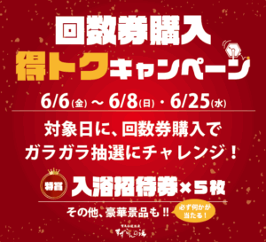 ![]() <回数券購入得トクキャンペーン> 6/6(金)~6/8(日)・6/25(水) 対象日に回数券購入で、ガラガラ抽選にチャレンジ! 特賞は、入浴招待券5枚!! その他、豪華景品が当たる!? ※景品は予定数がなくなり次第終了となります。 ※回数券購入は現金のみとなります。 |