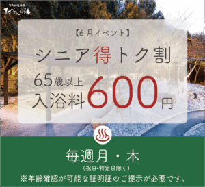 ![]() <シニアデー> 6/27(金) 65歳以上のお客様ご入浴利用で 次回使える平日600円でご入浴可能な チケットをプレゼント。 ※年齢確認が可能な証明書のご提示が必要となります。 |