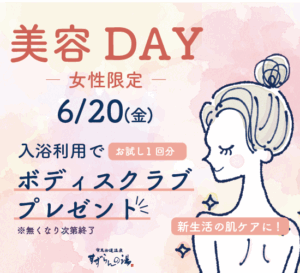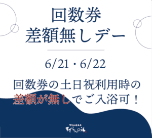 ![]() <回数券購入得トクキャンペーン> 6/6(金)~6/8(日)・6/25(水) 対象日に回数券購入で、ガラガラ抽選にチャレンジ! 特賞は、入浴招待券5枚!! その他、豪華景品が当たる!? ※景品は予定数がなくなり次第終了となります。 ※回数券購入は現金のみとなります。 |