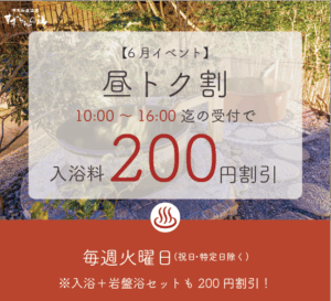 ![]() <メンズデー&レディースデー> 6/11 メンズデー ・6/18 レディースデー 対象のお客様ご入浴ポイントが“3倍” LINE登録でポイントカードをGET! ポイントを貯めて入浴1回無料チケットをGET! |