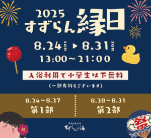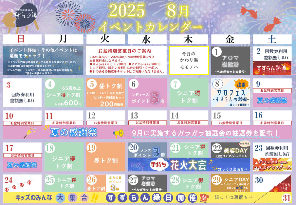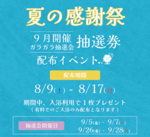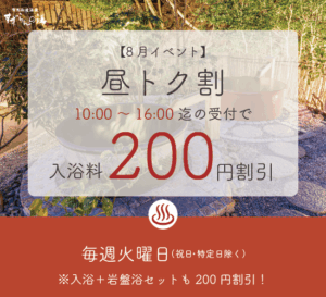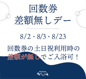 ![]() <回数券差額無しデー> 8/2(土)・8/3(日)・8/23(土) 回数券の土日祝利用時の差額が無しで ご入浴いただけます! |