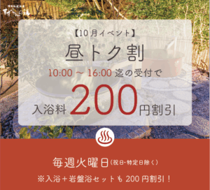 10:00~16:00迄の受付で入浴料“200円割引”