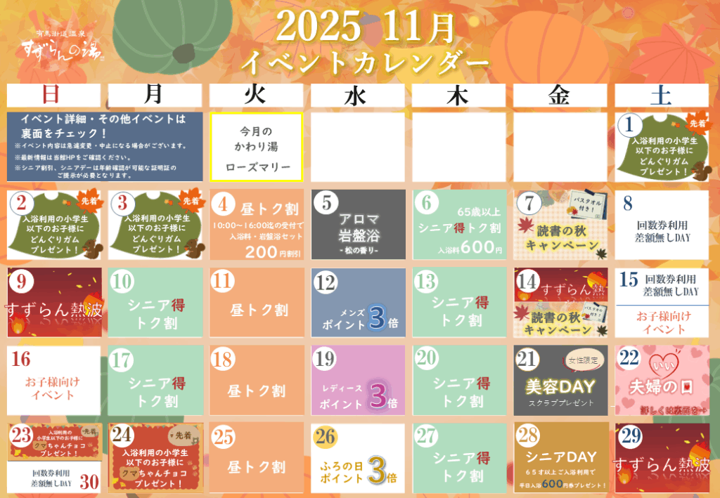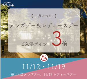 ![]() <メンズデー&レディースデー> 11/12 メンズデー ・11/19 レディースデー 対象のお客様ご入浴ポイントが“3pt” LINE登録でポイントカードをGET! ポイントを貯めて入浴1回無料チケットをGET! |