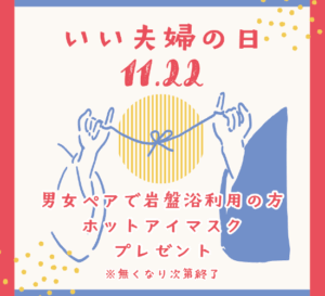 ![]() <いい夫婦の日> 11/22(土) 男女ペアで岩盤浴利用のお客様に ホットアイマスクをプレゼント!※無くなり次第終了となります。 |