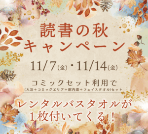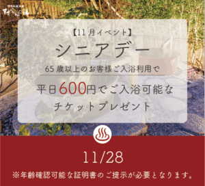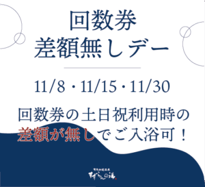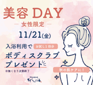 ![]() <メンズデー&レディースデー> 11/12 メンズデー ・11/19 レディースデー 対象のお客様ご入浴ポイントが“3pt” LINE登録でポイントカードをGET! ポイントを貯めて入浴1回無料チケットをGET! |