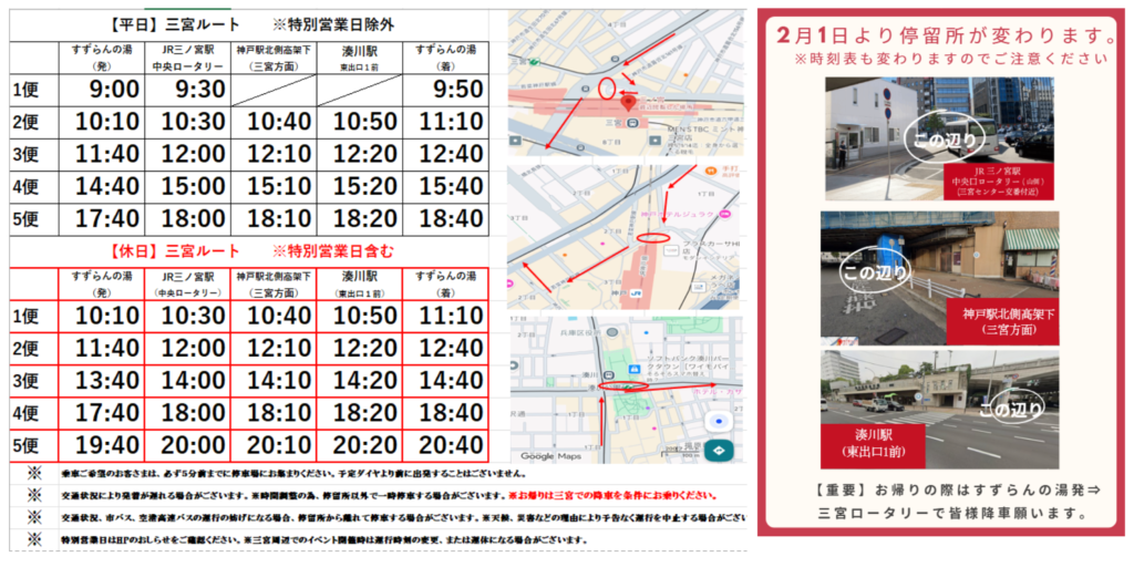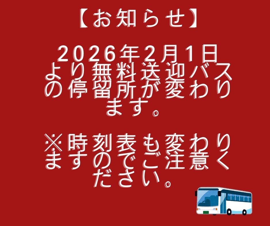 【無料送迎バスに関する 重要なお知らせ】 2026.01.15 Tweet Share Hatena 2月1日より無料送迎バスの停留所が変わります。(※時刻表も変わりますのでご注意ください) Tweet Share Hatena