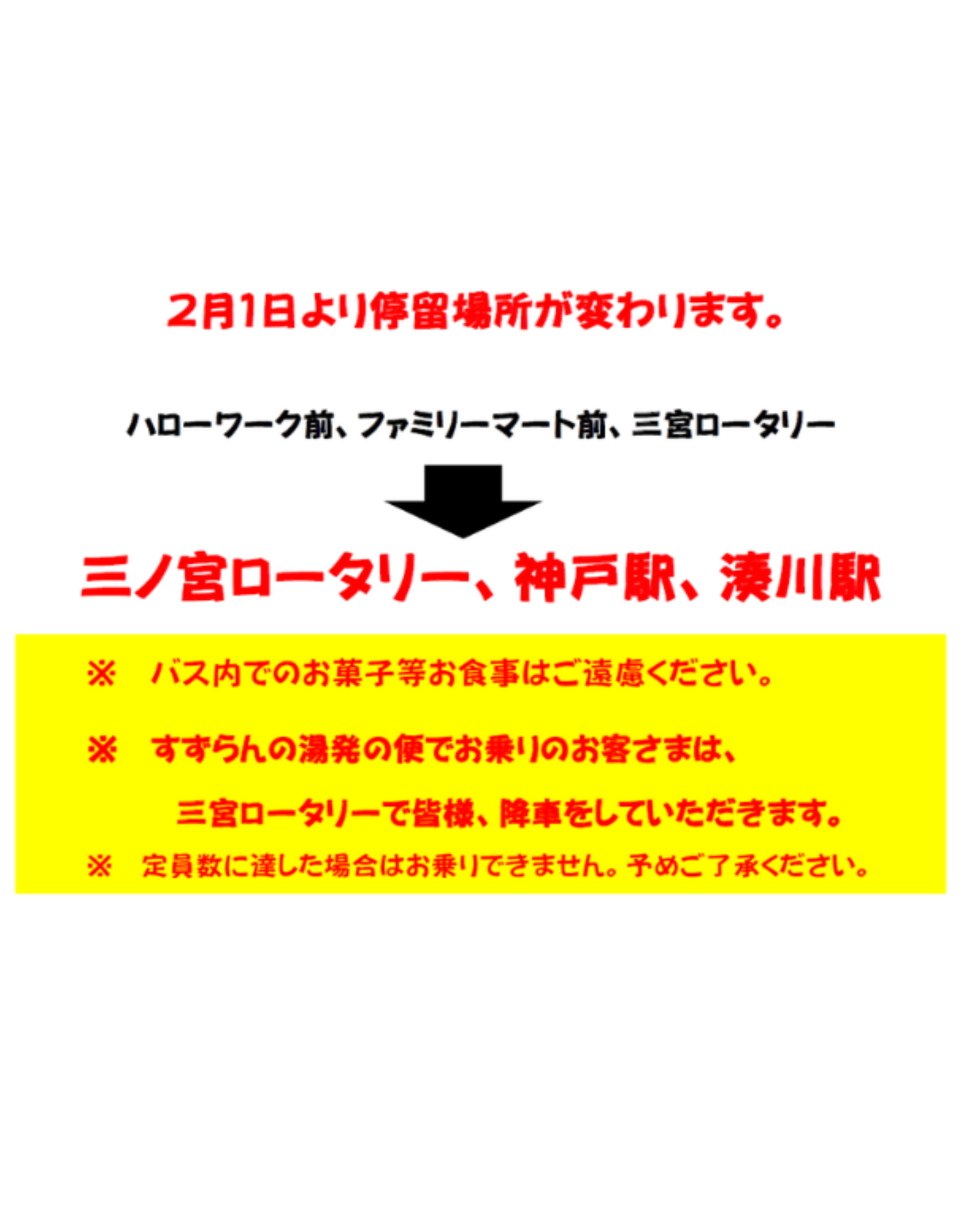 【三宮便無料送迎バスに関する 重要なお知らせ】 2026.01.15 Tweet Share Hatena 2月1日より三宮便のみ無料送迎バスの停留所が変わります。(※時刻表も変わりますのでご注意ください) 筑紫が丘・小倉台・谷上・神戸北町・北鈴蘭台駅ルート、鈴蘭台駅ルートは変更ございません。 Tweet Share Hatena