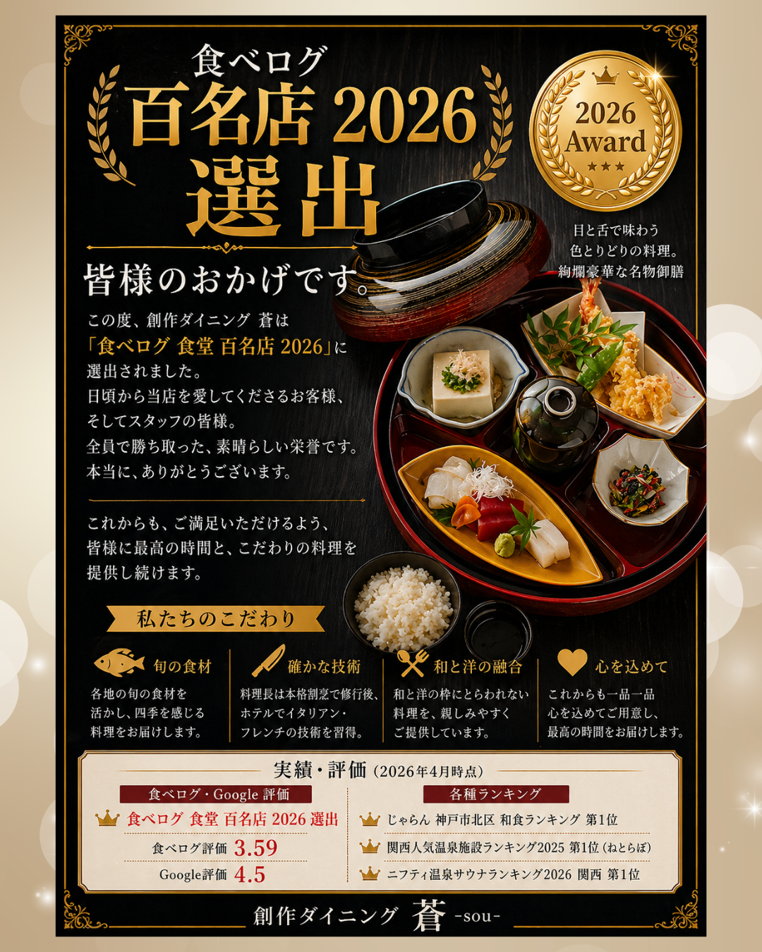 2026.04.28 Post Share Hatena LINE note 有馬街道温泉すずらんの湯のお食事処、創作ダイニング蒼ーsouーが食べログ100名店に選出されました✨ 日頃からご愛顧いただいている お客様への感謝の気持ちを込めて これからも最高のお料理と おもてなしを提供して参ります! Post Share Hatena LINE note