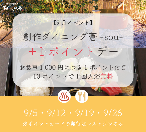 館内レストラン『創作ダイニング蒼-sou-』ポイントカードにてお食事1,000円につき1ポイント付与の所、合計ポイントより+1ポイント付与いたします!