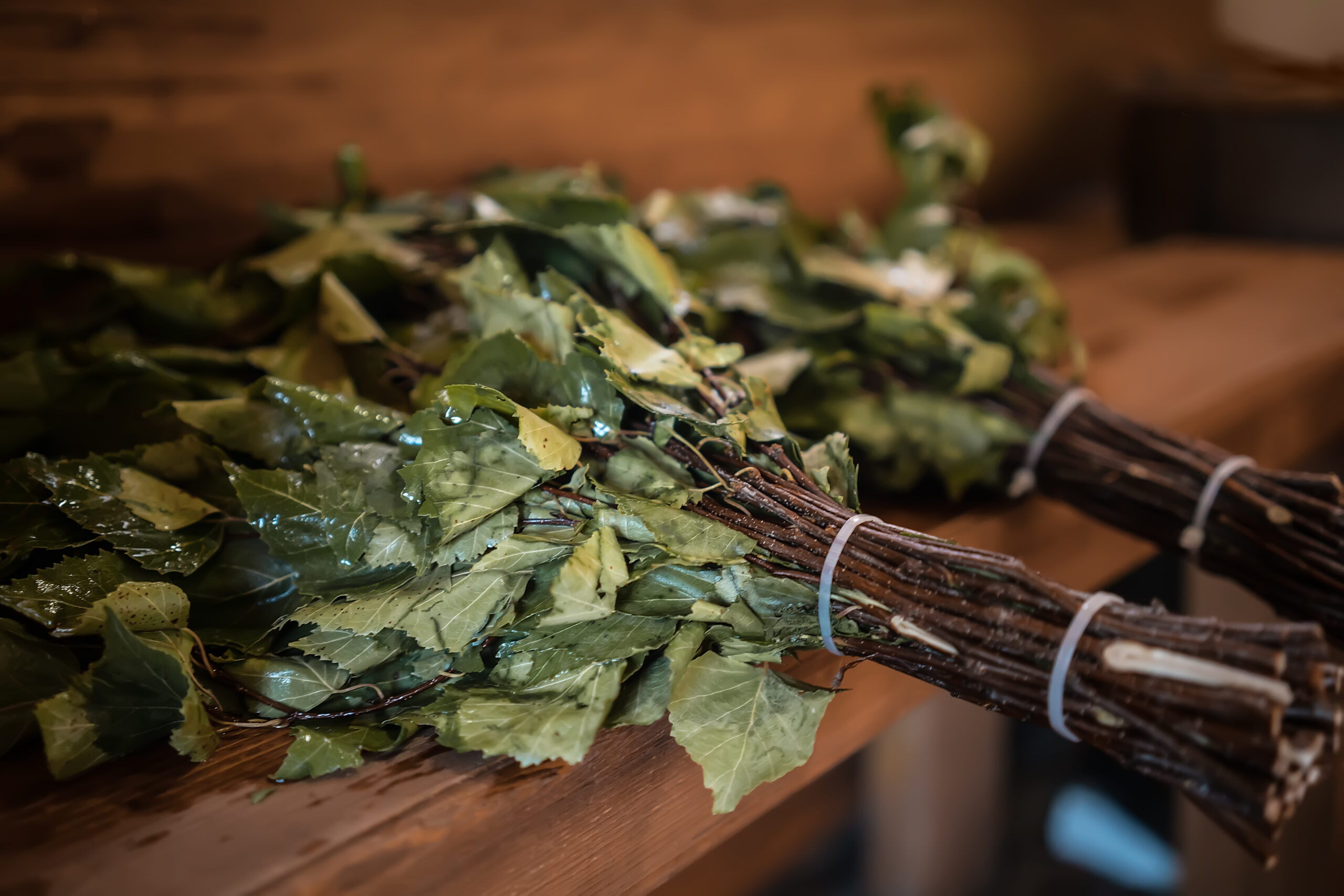 フィンランド伝統の入浴法で、白樺の枝葉を束ねた「ヴィヒタ」で体を叩き、血行促進&リフレッシュ!