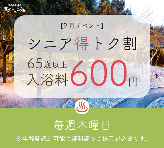 シニア得トク割【9月イベント】 2023.08.30 Tweet Share Hatena シニア得トク割 65歳以上のお客様、入浴料600円 期間:毎週木曜日 ※年齢確認が可能な証明書のご提示が必要です。 Tweet Share Hatena