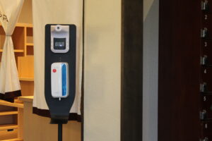 2・利用規約をお目通し頂き、入館について問題ございませんでしたら靴をお脱ぎになり、玄関右側に設置しておりますアルコール消毒・体温計測機にて「消毒と検温」にご協力をお願い致します。