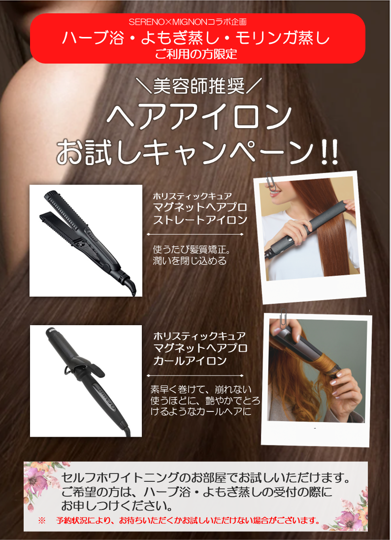 美容とリラクゼーションサロン「すずらんの湯MIGNON -ミニョン-」すずらんの湯内に併設されているサロンです。 美容×癒し×脱毛×ヨガ 温泉に浸かりながらリラクゼーションと美容ケアを一度に体験できる施設です。ハーブ浴やよもぎ蒸しによって体の内側からデトックスし、ヨガで心身のバランスを整えることができるほか、フェイシャルエステ、EMS、セルフホワイトニング、セルフ脱毛などの美容設備も充実しています。これらの施術は通常のエステサロンのような高額なコース契約が不要で、一回ごとのスポット価格の低価格で利用可能です。さらに、日サロも完備しており、気軽に美容とリラクゼーションを追求できるのが特徴です。