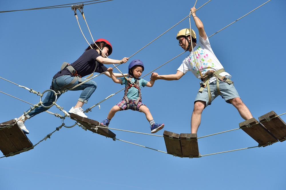 柱の間に架かった地上7mのコースに命綱を装着して挑戦する、スリル満点のコースを勇気と知恵で攻略して得られる達成感、充実感、解放感を全身で体感頂けます!