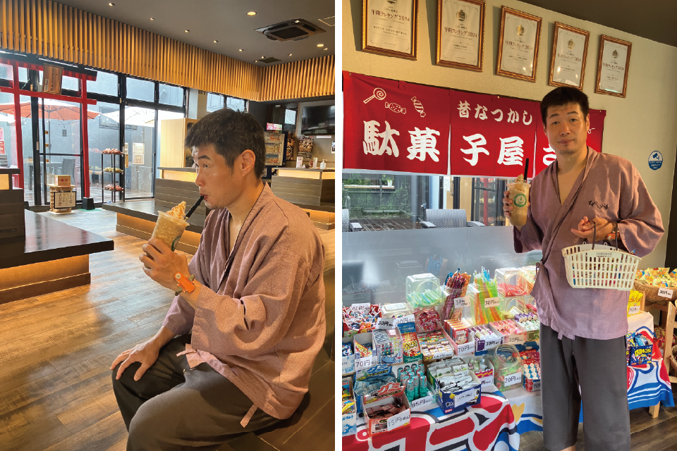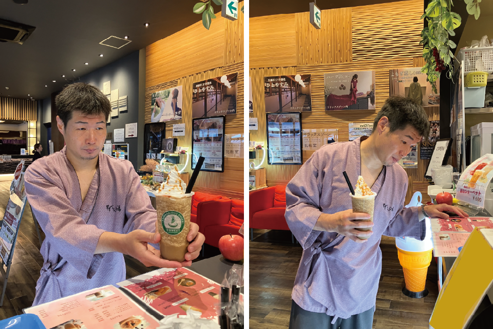 支配人:はい。この岩盤浴セットは土日問わず大人2,000円でご購入頂けます。基本の入浴券にプラス岩盤浴着やタオルセットも付いているので、大変お得なんです。専用のクールダウンルーム「冷汗室」や漫画コーナーは大変混み合う時間もありますが、ロビー横にあります中庭ウッドテラスでお寛ぎ頂けます。蒼スイーツでは人気のフラペチーノを始め、季節のソフトクリームなど様々なスイーツをご用意しています。長谷川様も召し上がっていましたね!