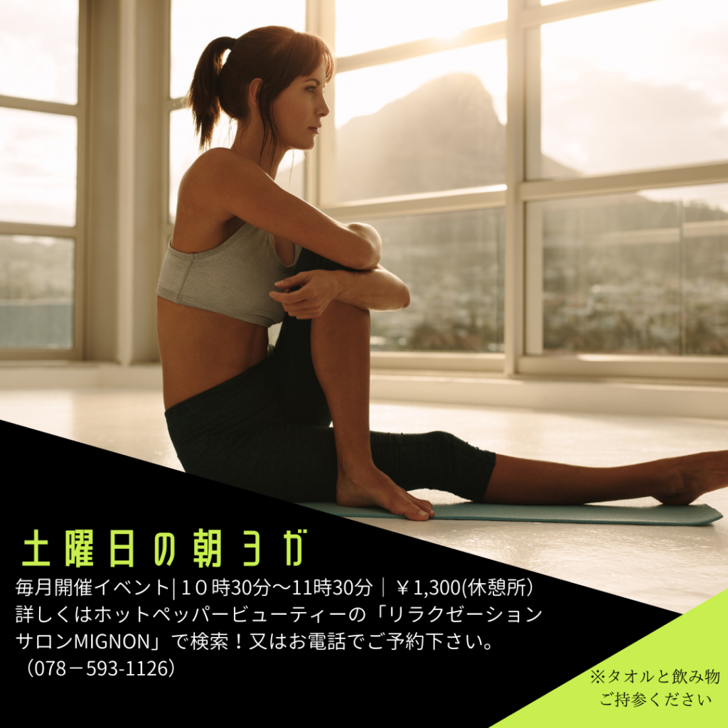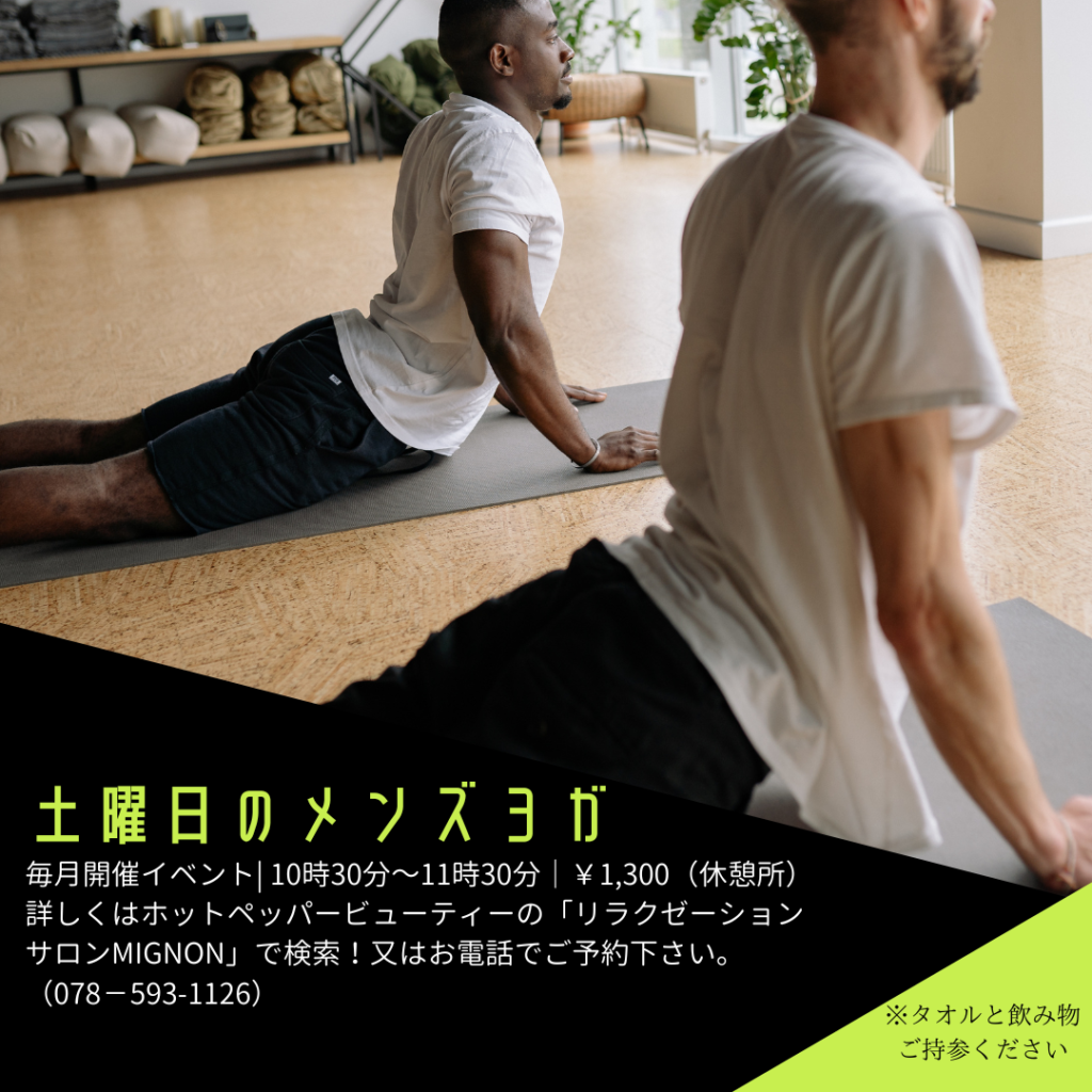 その他、ホットヨガ、メンズヨガ、土曜のヨガなどイベントクラスはホットペッパービューティー又はリラクゼーションサロンMIGNONイベントカレンダーからご確認ください。