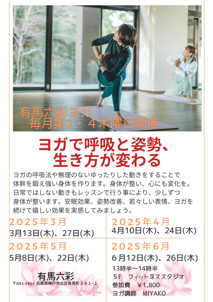 毎週第2、第3木曜 13時半から14時半は有馬六彩にて出張ヨガ開催、